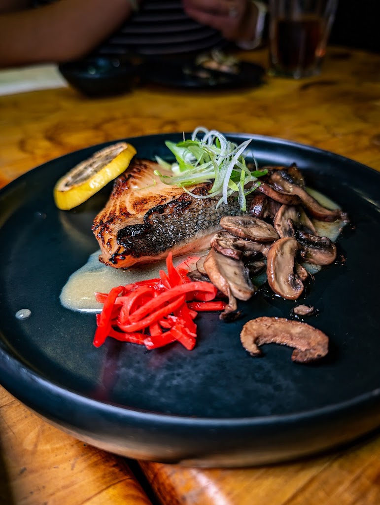 The place has a typical izakaya, casual vibe. Pretty decent amount of seating in their dining room. I made a reservation for a Thursday evening, but probably could have gotten a table as a walk-in. The service is attentive and everyone on their staff contributes to providing a good guest experience. Can t say that I was a fan of the food as much. Tried their apple salmon sushi rolls and I found that they had too much mayo flavour in my opinion and wasn t really too impressed by the quality.