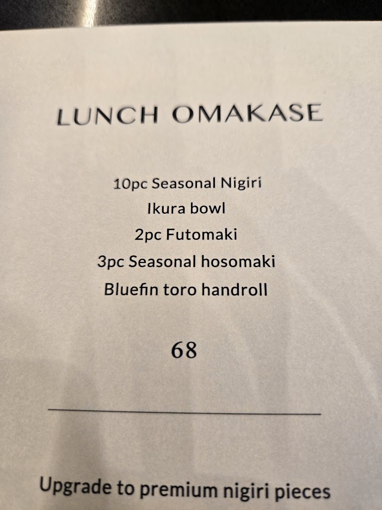 Food was excellent, the dishes paired perfectly with the drinks that were on menu. You can tell that the chef has specially curated each item and didn t necessarily choose things out of popularity. For example, the sparkling jasmine tea was fantastic.. I later tried to find this drink but was quite disappointed that it s a very difficult item to get! One item was very interesting - the futomaki was not like any other I have had before. In fact, I don t personally enjoy it much but really did when the chef made his version of it. We had tried the premium lunch omakase. We would love to come back. Staff were attentive and nice. It s quite a relatively large restaurant for such a small seating.. the ones downtown a much smaller - but you also get to see everything (a lot of their fridges were in the preparation area).