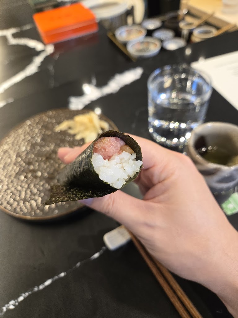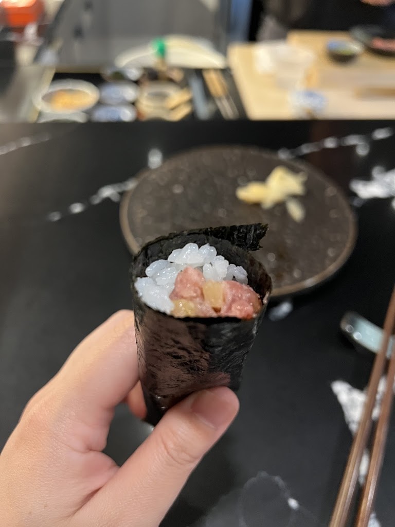 Food tasted very good. My squid nigiri was very small. There was a noisy table beside me and the chef gave me smaller pieces for some of them. She also forgot one of my pieces and gave it to me at the very end, maybe also only gave me 9 pieces. Thats a little unexpected considering the price paid if one piece is missed. Not sure if she did it on purpose bc all the slices of fish are laid out beforehand so she couldnt miss it. Maybe she saw me staring for a while in shock at the small pieces. I was trying to keep from being disappointed, and when she asked if everything was ok, how can I say that the piece was so small politely? The tea is $3 with unlimited refills but they keep the teabag inside the cup, with a very tiny teacup so I was constantly asking for refills. I think the cup is supposed to be that tiny. Hand roll was surprisingly tasty. I like how they tell you exactly what the sushi is when they serve it to you. Love how they put the soy sauce on there. The door is normally locked. I thought maybe you needed a reservation. They seemed to not be expecting guests. I waited outside they just looked at me instead of greeting me, and I had to ask if the restaurant was open instead of being greeted and led to the table properly. I ended up changing my seat bc they didnt tell me where to sit and the restaurant is very small. They will hang up your coat and pull out your seat for you though.