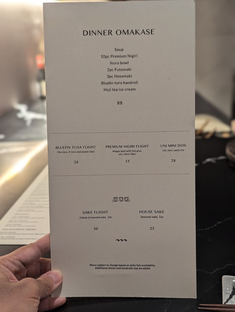 Amazing experience. Small capacity but it is perfect for the personalized feeling and a great use of the space. We had the signature menu which was very nicely hand crafted. They take a lot of effort not only in the quality of the food but also the preparation and presentation. This is an overall experience and not just a dinner. I would suggest upgrading the nigiri to get the premium package. Will definitely be back!!