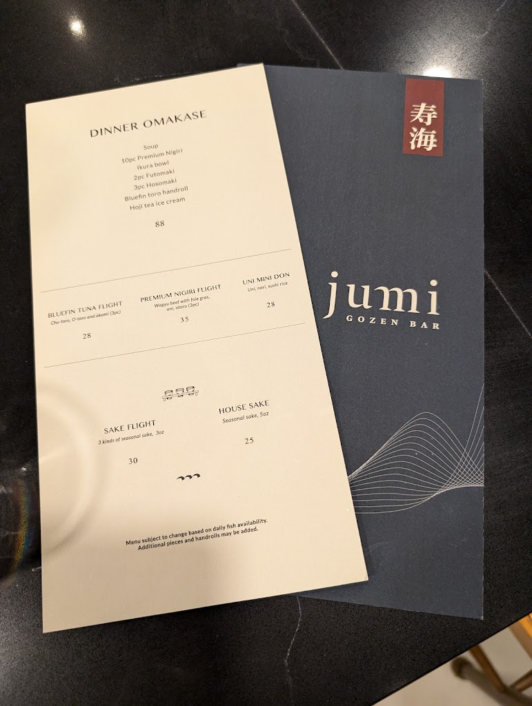 I had a wonderful experience at Jumi gozen bar! I felt like the serving was slower than usual, but the quality of food made up for it. Everything was really tasty and plating was also very pretty! Atmosphere of the restaurant was really cozy. Overall my experience was excellent!