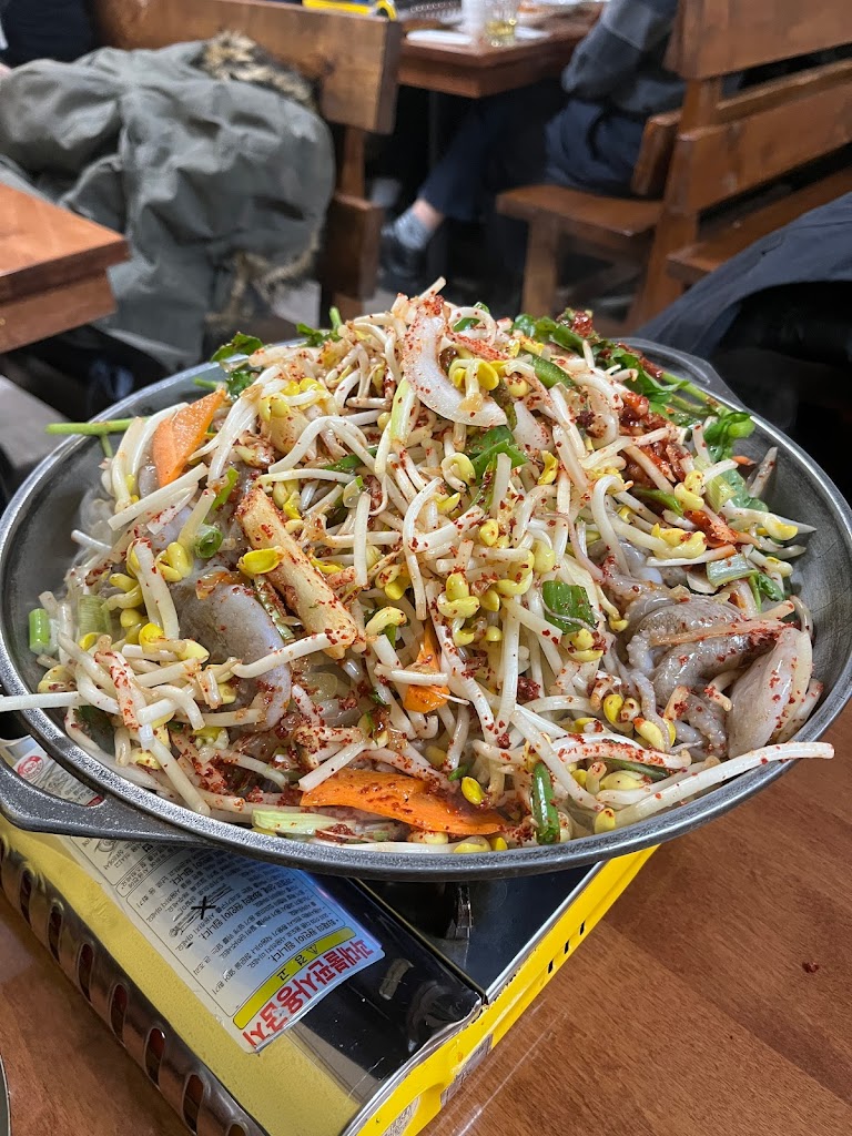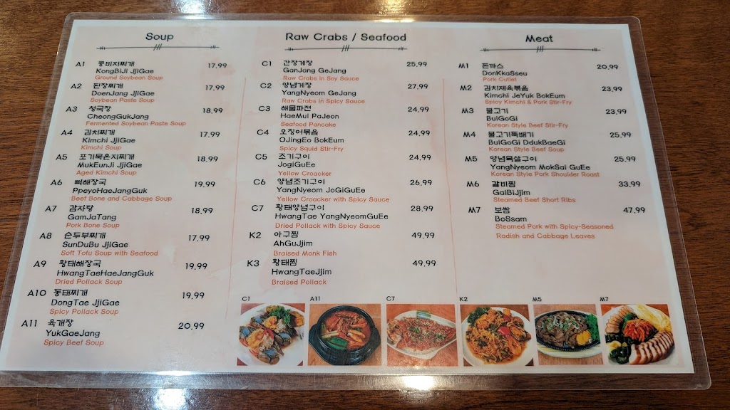 -Marinated crab: 5/5 -table stir fry squid and veg: 3/5 - seafood and tofu soup: 4/5 Overall great experience and authentic food. I personally don’t like the marinated crab but my husband loves it. The table stir fry just contains beans sprout and few squid and costs $50…. It’s tasty but way too expensive. VERY GOOD SIDE DISHES! Love the potato and their kimchi! Store is small but cozy. Service is fine.