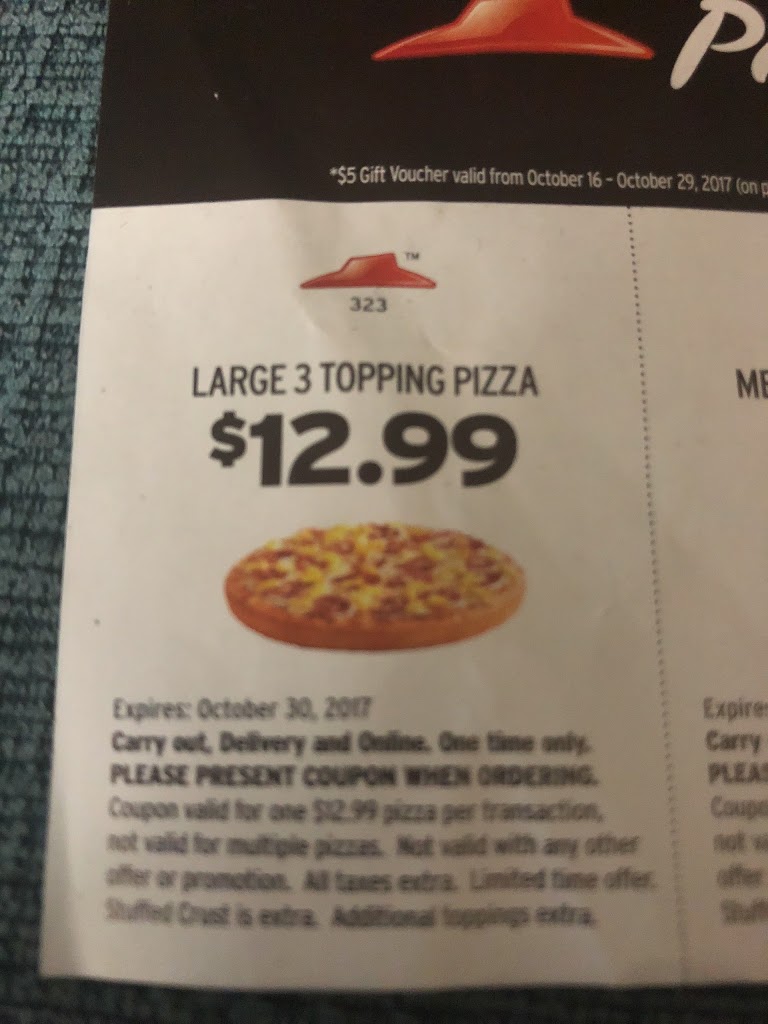 First and last time from this location; will never order from here. I always liked their pie(pizza hut)mostly as the crust for me was better then most. But this location served me something akin to cardboard with dried out toppings. Makes me hesitant to order from pizza hut again.
