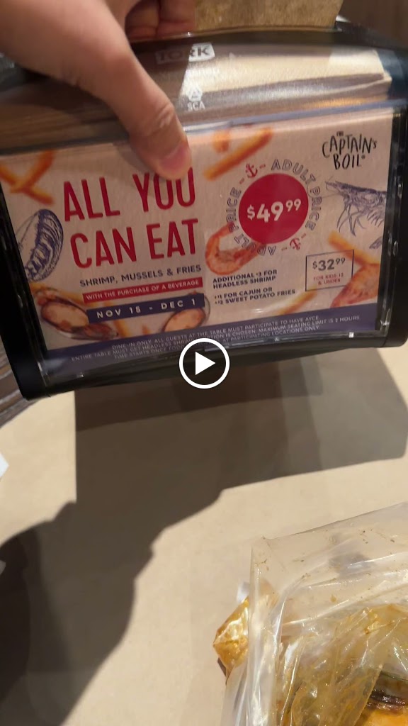Worst captain boils I ever been never ever going back here and I would not recommend going here worst serving we came here around 745 they serve us 830 and also they all confused 4 people come to use asking us for our order small serving as well if i can give negative 10 in this place i would! Look how messy our table yes were done eating at this time but there is no plate available! That s why it s so messy! This is a total freak show !
