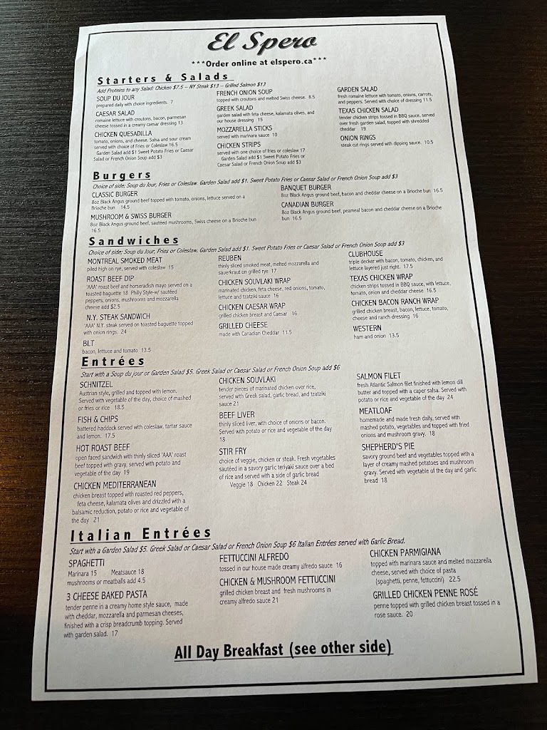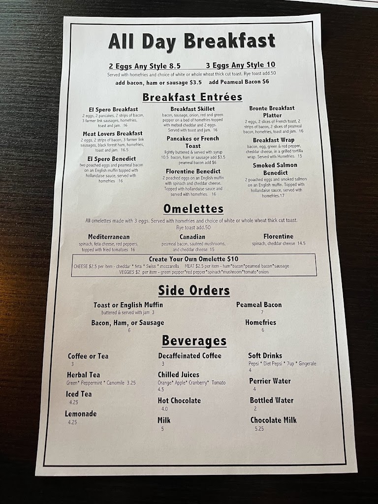El Spero is a good family restaurant, been going there for years, I do get breakfast every time, so this review is only based on breakfast. The breakfast itself has improved over the years, a few homefries out of every batch used to be undercooked back in the day but now they are more much more consistent. The pancakes, eggs, and toast are usually consistent and great. The bacon is 90% good, sometimes undercooked. The service is usually welcoming, and because it is a family restaurant the community wants to see it succeed. A major area for improvement and something the owners need to work on is the hot chocolate, the price increases every year and the quantity decreases, the last time I went there (today) even the whipped cream didnt reach the top of the cup it was basically a half cup. If someones getting a half cup, they should pay half price. Soon it will be $7 and quarter cup at this rate so I felt that I needed to mention here, hopefully someone will see it, maybe no one will, who knows. At the end of the day Im rooting for this restaurant, theyve been an Oakville staple for me for a while and I think theyll be around for a long time to come if they keep improving things.