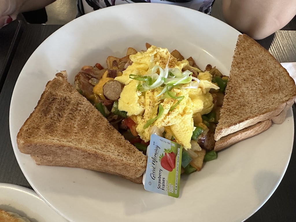 Good breakfast food options., large portion sizes and a very friendly staff. Also has a fun outside patio. Recommended