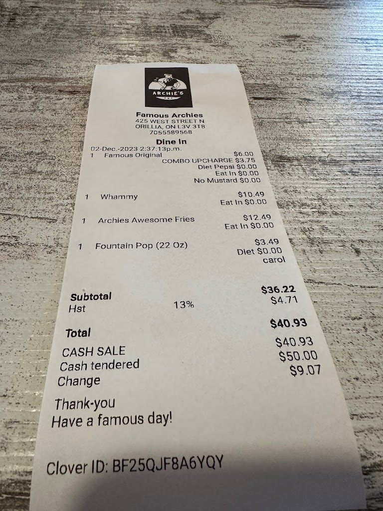 Alright alright alight so I ve been cooking in kitchens for 17 years worked my way through the ranks dishwasher, line cook ,sous chef chef. Worked all over Ontario in different styles of restaurants from flipping burgers to fine dining. Not only were the employees clean and polite, the restaurant was clean and stylish, great atmosphere. I got myself a large poutine which was perfectly done and a triple smash burger to my liking. Their burgers usually come with one to two patties but for a $2 charge you can get yourself an extra hamburger patty and there s nothing wrong with that. The smash burger was perfectly done cheese was melted bacon was perfect and the bun was soft and fresh. There s many places around you can get a burger but if you re looking for great smash burger with tasty flavour and a clean friendly staff I d suggest giving Famous ARCHIE S a try it s well worth it and they ll be seeing a lot of me. Extremely happy customer. Thanks for the great meal! Dietary restrictions: Willing to do any reasonable dietary restrictions or mods Kid-friendliness: Fun family atmosphere for all ages Wheelchair accessibility: There is wheelchair access around the store square plaza
