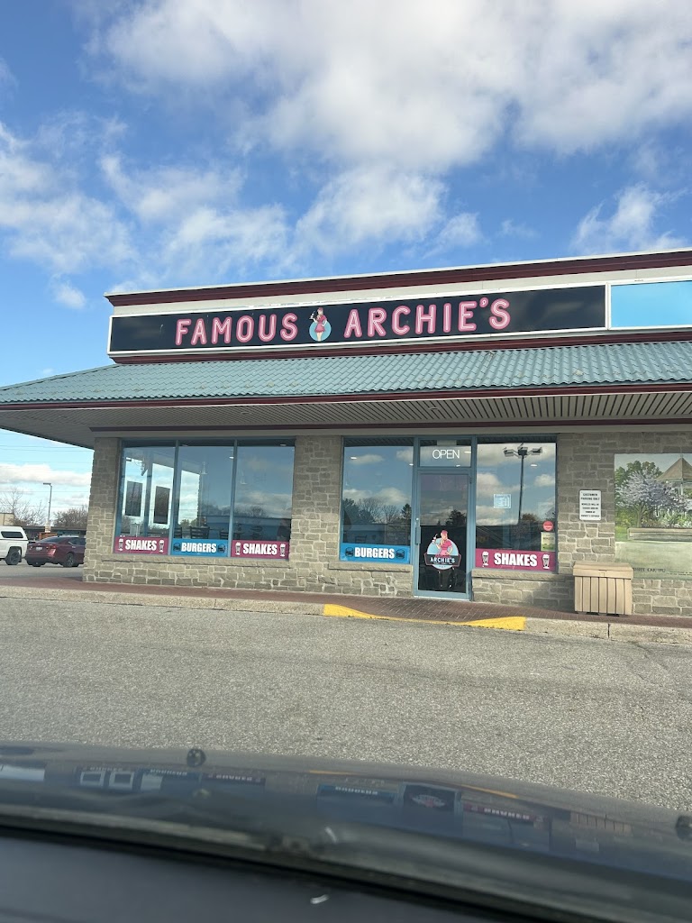 This place is a true gem! My husband and I had the pleasure of dining here for lunch a couple days ago. As soon as we walked in, we were greeted with smiles and a huge welcome by the very friendly staff who resembled Archies very own Betty and Veronica. Love that! But the atmosphere is what stole my heart immediately. It was like we walked out of 2023 and into the 1980s. Not only is it bursting with bright, welcoming colors, but the music was on point. Playing Micheal Jackson banger after banger. We ordered a couple burgers, poutines, and a vanilla and chocolate milkshake. Famous Archies has brought the smash burger back to life. The milkshakes were AH-MAZING. The whipped cream, sprinkles, and cherry on top were so nostalgic. We enjoyed them to the last drop. The poutine was the perfect size! If you are into squeeky cheese curds and a gravy with a deep flavour, then I highly suggest you try it out! We enjoyed every aspect of our lunch date. We plan on returning very soon. Thank you for bringing a much needed piece of nostalgia to Orillia!