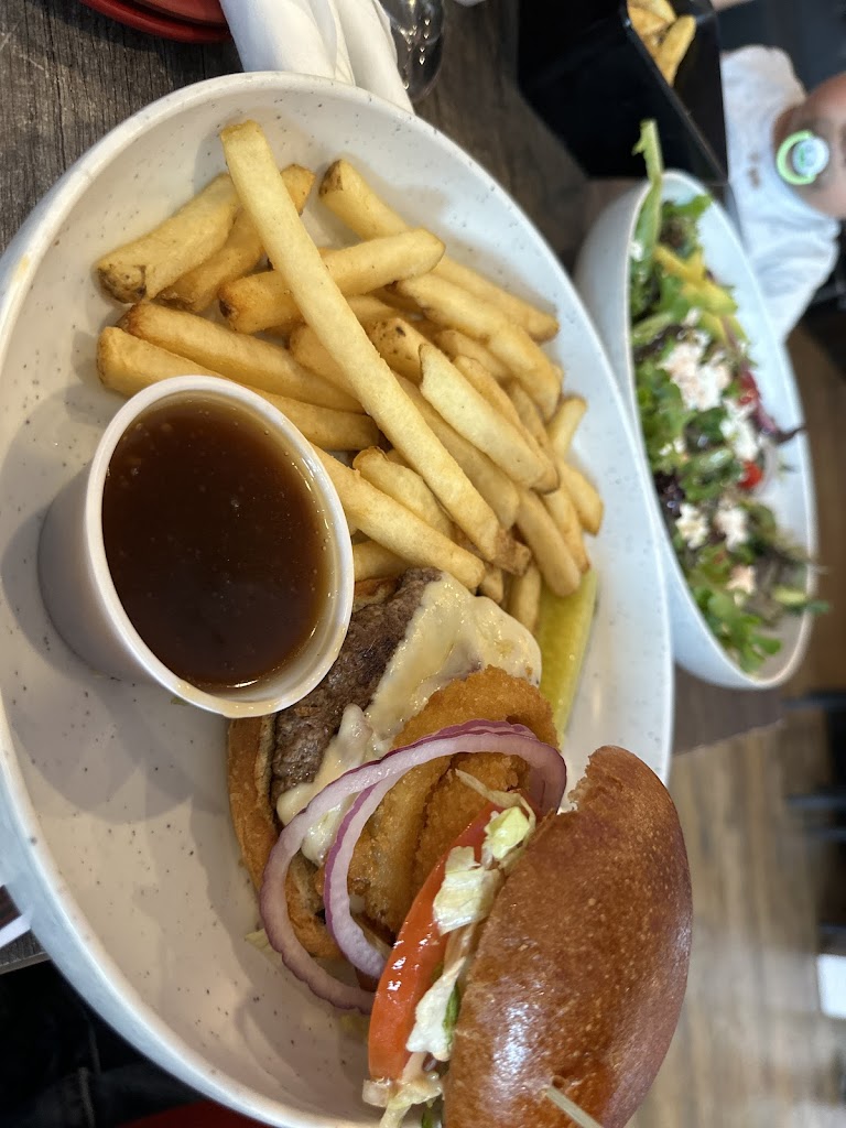 Best patio with a great Burkrn burger(fried chicken and a smash burger with bacon and cheddar cheese) Lindsey our server was fabulous and recommended the food but the service level was impeccable given that it was the Scottish festival in Orillia and they were so busy. That speaks volume for the kitchen and service. Kudos to the staff and management for keeping it in line.