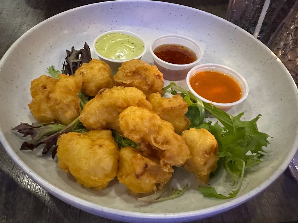 We were three. Easily accommodated with no wait. Staff friendly and helpful. Our orders were taken and arrived quickly and efficiently. Wings were devoured by my two companions, with starter for one poutine and the other the Bavarian pretzels. I enjoyed the Singapore noodles with Bam Bam shrimp. The menu cries out for further visits.
