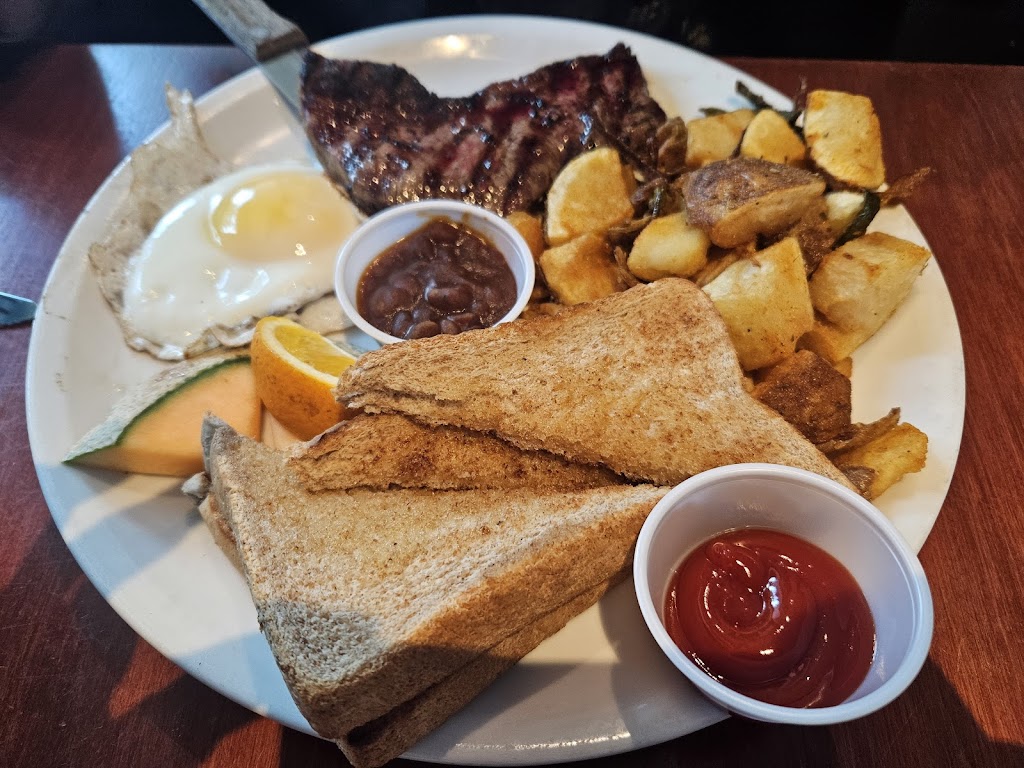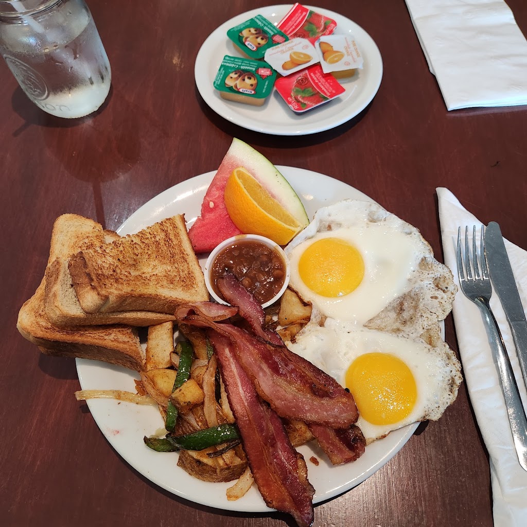 My meal was fantastic I had 2 eggs bacon toast home fries baked beans large milk. I was so full fantastic all round not so much for my son though he ordered a breakfast Burger the egg on the Burger was not cooked properly They redid the order and use the same Burger as the bun was soggy disappointed in this But I will definitely recommend it to my friends and I will definitely be coming back