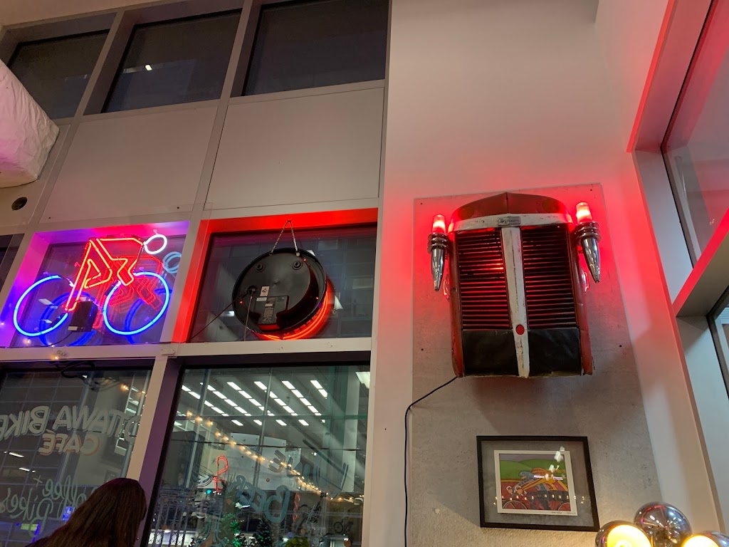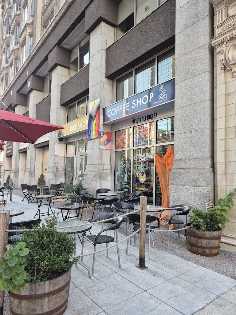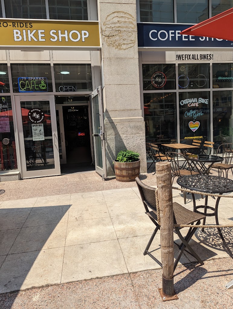 On the East end of Sparks Street this New Bike Cafe is geared towards cyclists and recreational riders alike. Built into the Retro-Rides store, one can walk inside with their bike (while wearing a mask) order up a Large Brew Coffee or any number of different caffeine drinks along with some nice scones or muffins to top the ride in off. Seating space is a very large roped off patio area that places you in the center of the traffic of Sparks street. With music playing in the background and tourists and citizens traveling the cobble stone road. It is definitely a great place to stop for a refreshment.