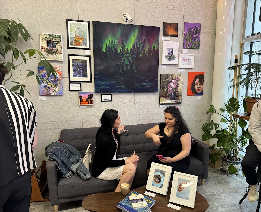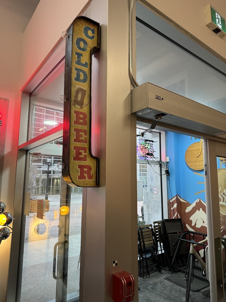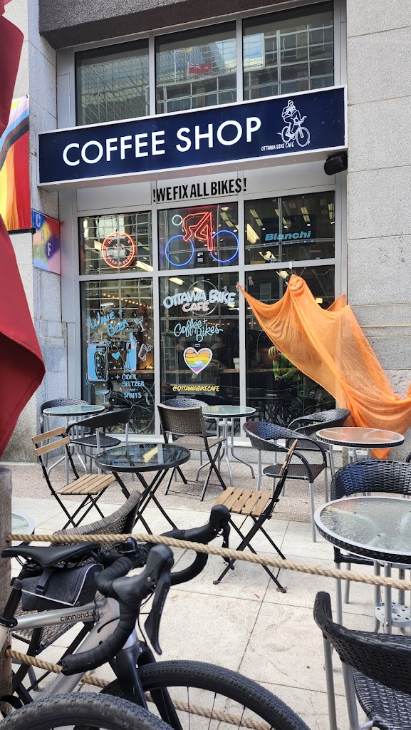 Nice, unique concept of having a coffee shop with option of renting/fixing bikes. This place happens to be at an excellent location on Sparks Street with lot of foot traffic in summers. Car parking can be a challenge but then that's why you need bikes lol. It's a cozy little place to sip coffee (beer as well), enjoy the vibrant paintings on display from few of finest local artists. We enjoyed being here and the warmth of staff was very welcoming. Will surely come back whenever we are around.
