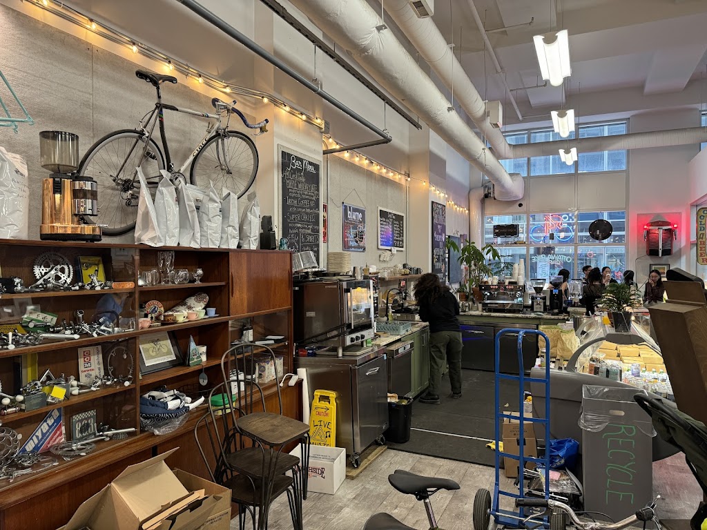 This is such a beautiful space. It s a bike place but you can also get coffee. Love it!