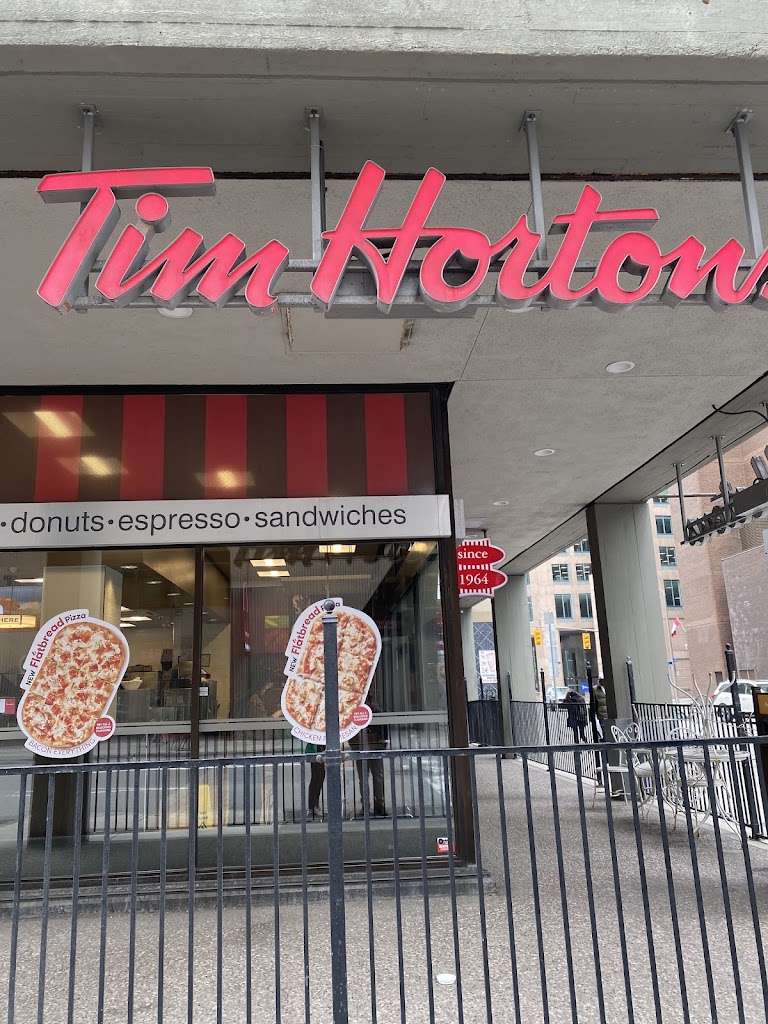 On the corner of our hotel, with a small terrace with three tables outside, fast service, and always so economical, we love Tim Hortons Around the corner from our hotel, with a small terrace with three tables outside, quick service, and always so cheep, we love Tim Hortons At the sight of the next hotel, with a small terrace with three small tables, fast and easy service, like Tim Hortons.