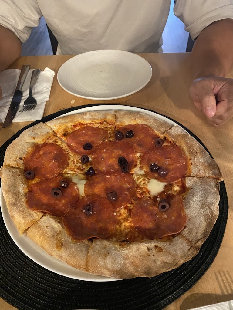 We only ate one pizza each, with normal beer (our choice). My wife got an Oliva, I got a Diavola. For being outside Italy, an excellent pizza: crust not too big, thin base and not too soft. Simple but tasty condiments, the Diavola is very spicy and tasty. Kind and friendly staff. Elegant and simple environment, not pretentious. Excellent experience
