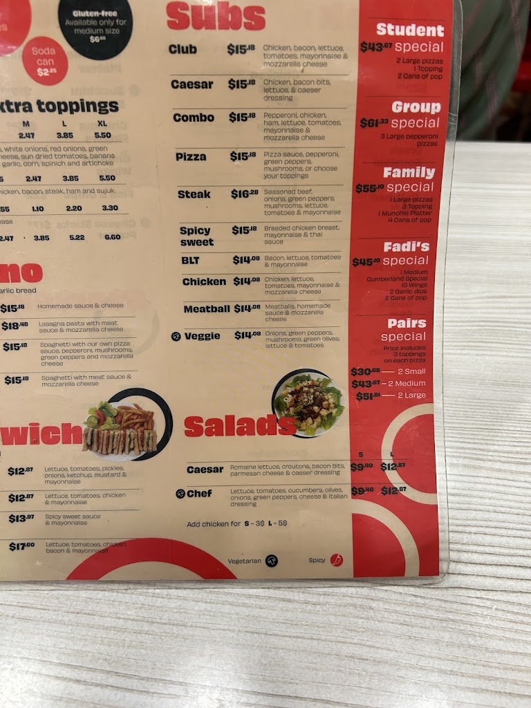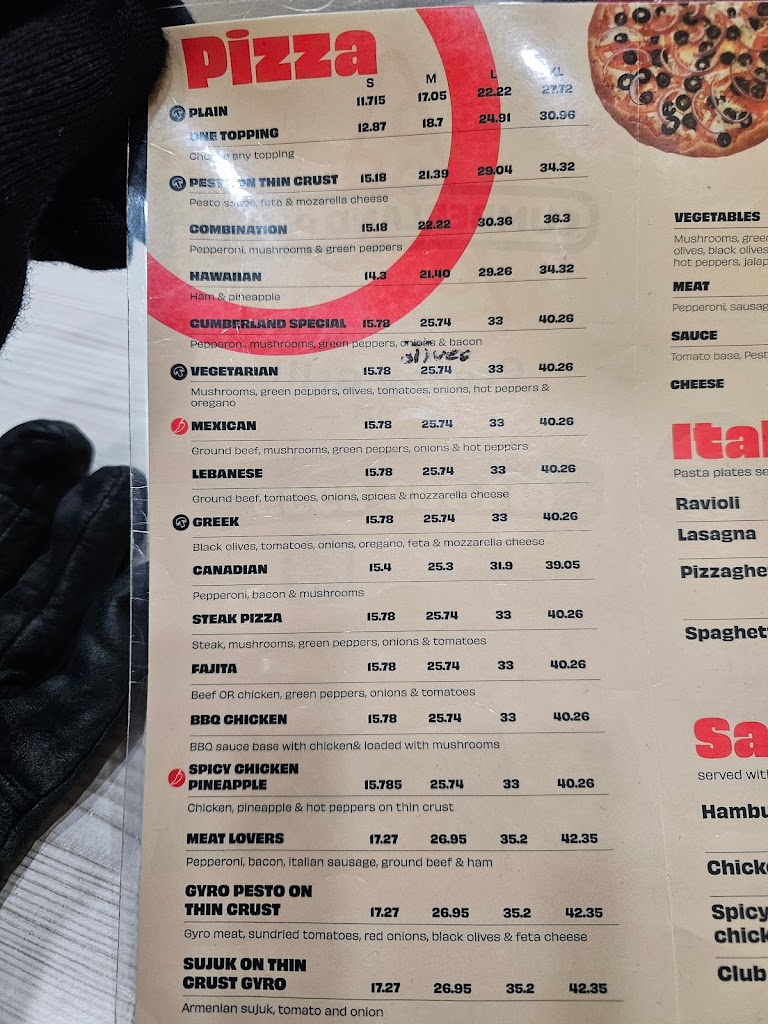 The Cumberland special pizza and the salad we had was very fresh and delicious. I highly recommend Cumberland Pizza to everyone who enjoys real fresh food and we also choose the medium crust. 5 rating all the way . Attila from Toronto