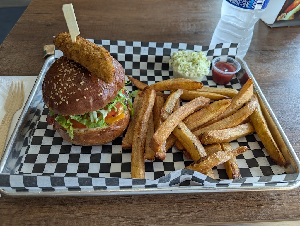 Had the burger platter of my dreams here today. A portobello veggie burger with white cheddar which came with coleslaw, hand-cut fries, and a deep-fried pickle on top. Bun was pillow-soft and the staff was really nice. Good music in the restaurant too. 10/10!