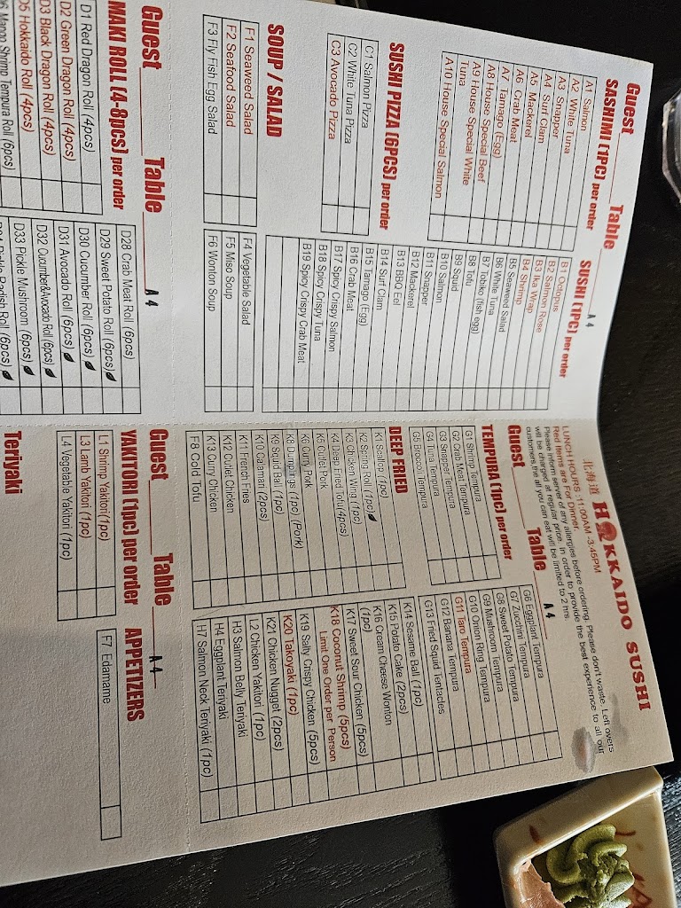 I had been looking for another place to eat AYCE sushi after another restaurant lowered sashimi quality recently. Hokkaido sushi did an excellent job delivering on the experience I was looking for. The inside is cozy, the menu offers several interesting options including beef sashimi, and the presentation of the food was good. Service was about what you'd usually expect at an AYCE sushi, menu items were ordered using a paper order sheet, price is comparable to other AYCE options. Whoever was doing the deep frying in the kitchen was talented as every deep fried item was cooked to perfection. Meat items were also cooked more attentively than at competitors. Good experience. Would recommend and return.