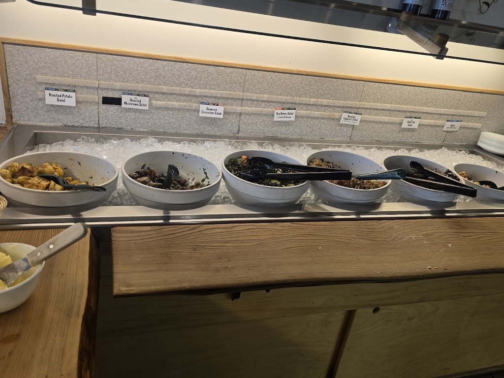 Not as many hot options as in past. Food lukewarm. Salads ok. Tasteless dessert. Sorry Green Door!