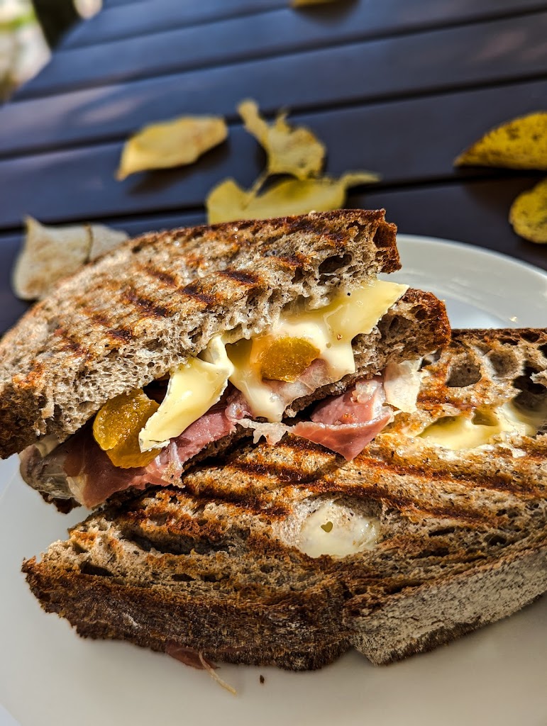 Short but delicious menu. Oka/apples/spinach grilled cheese luscious (traded the bacon for spinach from the traditional le classic). Coffee is excellent. In short, an excellent place to have a bite to eat, and not expensive too. The smile of Bibiane, the friendly owner, is worth the detour in itself. And there, in the heart of autumn which is vibrant at Mont St Hilaire, happiness. L Vachon
