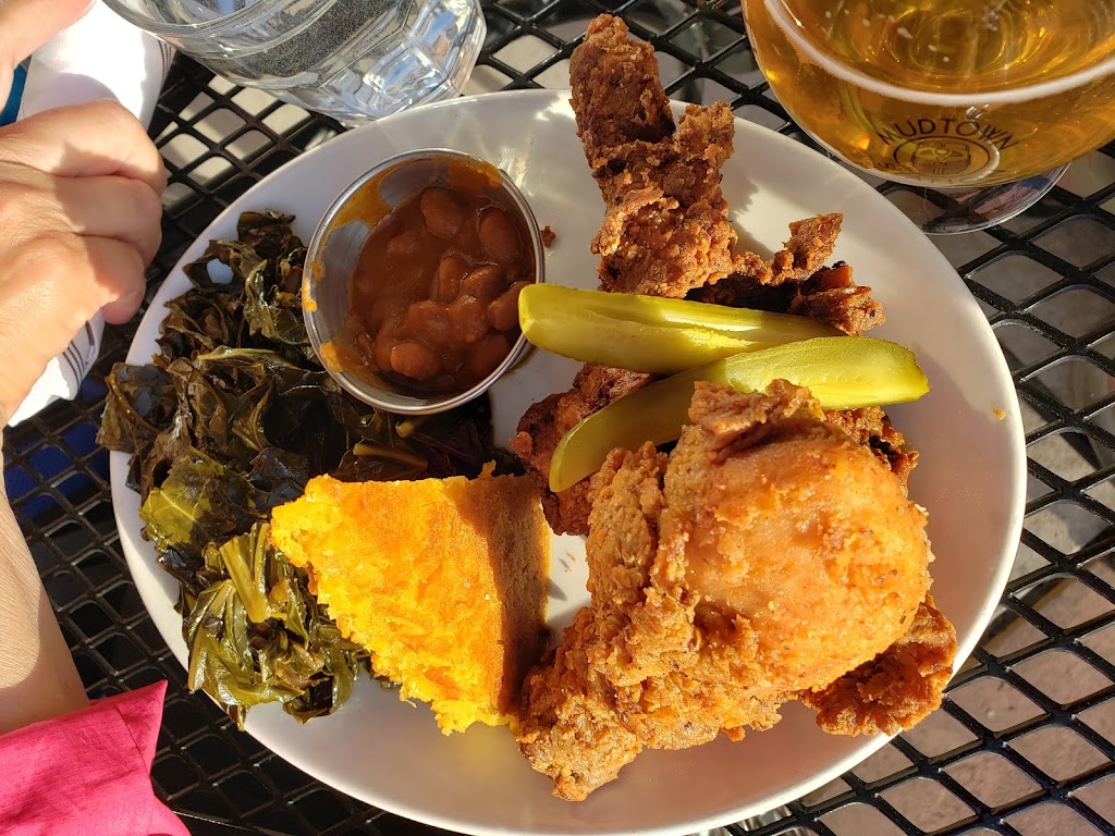 Came here on a recent trip and was able to sit outside on the lovely patio. Our server was friendly and right away informed us there would be a bit of a delay for food as the kitchen was backed up. We didn't mind waiting while relaxing outside and sampling a few beers from the tasting flight, which were all good. The menu is small, but everything looked tempting, and I was super happy with my smoked pork sandwich. My partner wished the chicken and waffles had a bit less sauce, but the flavor was good, and he enjoyed it. Next time we are in town, we'll be sure to come back.