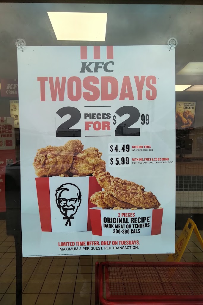 TWOSDAYS IZ my favorite promotion these days and every visit makes my day when order taker smiles asking me "thank you for choosing KFC, may I take your order" from the front counter to the back in the cooking area, I suggest it as a must -ear restaurant. I say as I am leaving, "see you next TWOSDAY" I always order original type 2 legs which are quite large and worth your $2.99+tax
