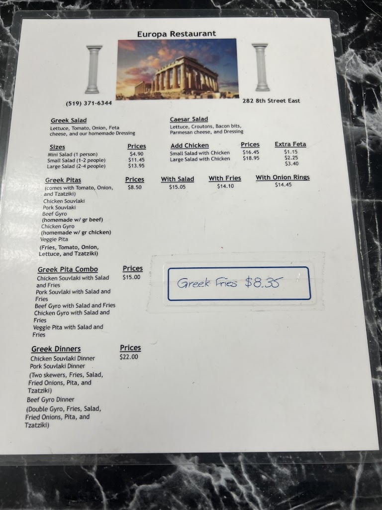 Ive lived in Owen Sound my entire life. The customer service and food at Europa is hands down the best you will get out of this town. Ive never experienced such genuine customer service in all my years in this town. They really do make you feel like family. Keep up the good work guys, you rock!