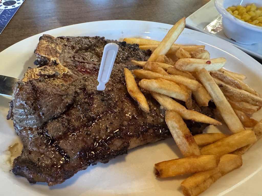 Food: Blandest Ribeye of my entire life, lukewarm fries, and canned corn. Service: Messed up the bill 3 times after making us wait 20 minutes after clearing the finished dinner dishes while it was very busy. Tried to mollify my disappointment with Chucks Bucks coupons. (as if Im ever going to give yall a second chance? Nah.) Friendly and professional *looking*? Yes. Competent? No. Atmosphere: Way too loud and crowded. This might change later if others have experiences like I didnt and do not return. Lights too dim to tell if it was clean.