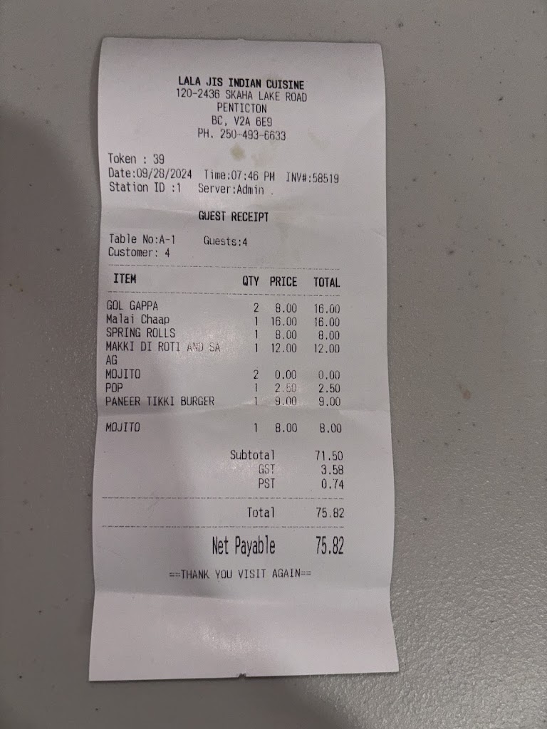 went for a lunch with my friends, ordered few appetizers, mains and drinks. Their Amritsari kulcha was so delicious, but a little disappointed on drinks, got delayed and the poor server was making the efforts with a chef or someone (who was on a call with them) to make our drinks and they know they don t know how to make drinks, but server said she has the license upon being asked! which was not true I believed, even though they know we were able to see all behind that curtain sitting there. We wanted to cancel the drinks, but server never came back to say anything. We got our drinks when we finished our food and had to return those and again got no explanations from that server, Otherwise, good food!
