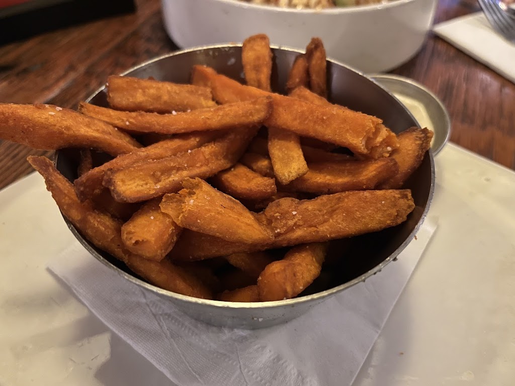 It’s really great to have vegan “seafood” options, especially not typically ones. It would be nice to have some of the typical one too though like “fish” and chips. I found the vegan tuna nachos to be really unique and flavourful. It was not the most filling but that’s to be expected. Their other dishes looked filling. The vegan cheesecake was really good, it tasted like gingerbread. It could have used some presentation though. I enjoyed the yam fries and subbed for the vegan mayo but it would be great to have a vegan chipotle mayo. Good service and decor fit the aesthetic. I would definitely come back!