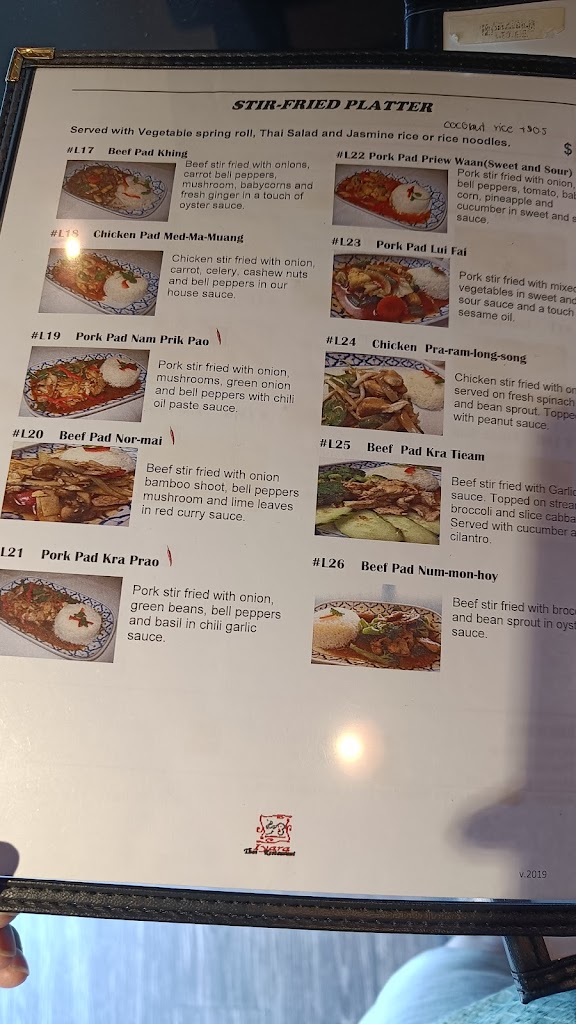 Decided on dinner platters thinking there would be a bigger portion (like the menu pictures) however it was not. Should be called a small plate, definitely not platter sized. Comes with rice or rice noodles and springs rolls or salad. We opted for spring rolls to start. Hot and crispy but bland and generic with a small portion of what seemed to be a basic plum sauce. Ordered chicken pra ram long song. It came cold. The peanut sauce was tasty however little chicken and veggie. Ordered beef pad kee mau, it was supposed to come with carrots and it did not. A mild light sauce that did taste good but again little beef and veggie. 2 dinner platters did not fill 2 of us up however it was a a decent price at $35 with a 15% tip. We do want to come back and try 3 dishes to fill us up. Lots of potential just lacking follow through!