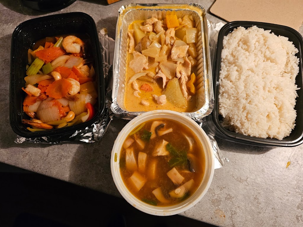 Ordered through Skip. Food total was $50 + $15 for fees. Half order of TomYum chicken soup, prawn cashew and chicken yellow curry with large coconut rice. Taste good. Looks ok.