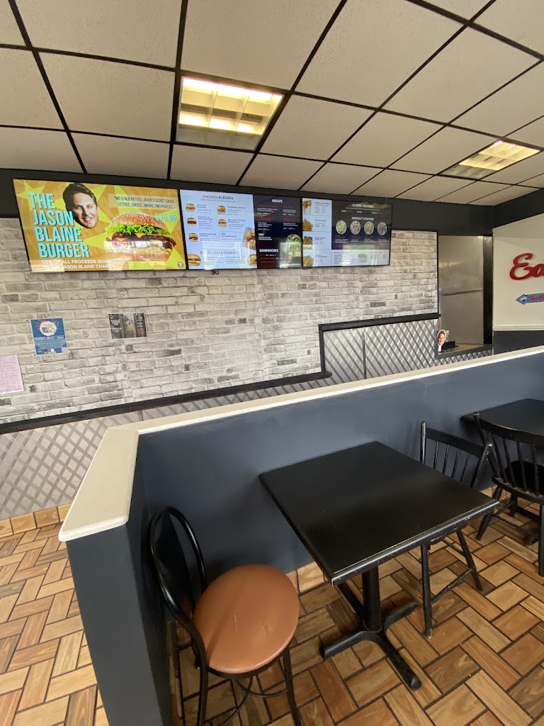 A most excellent menu. We chose the hickory crunch and mushroom Swiss melt burgers. Fries and onion rings. Large servings, excellent ratio of onion to batter on the rings. Fries were some of the best I’ve had. The burgers were delicious perfect size, excellent taste, melt in your mouth bites just absolutely wonderful after a very long day. Well done, be seeing you again!! Only 4 stars for atmosphere as we did take out but it’s very clean and neat inside.