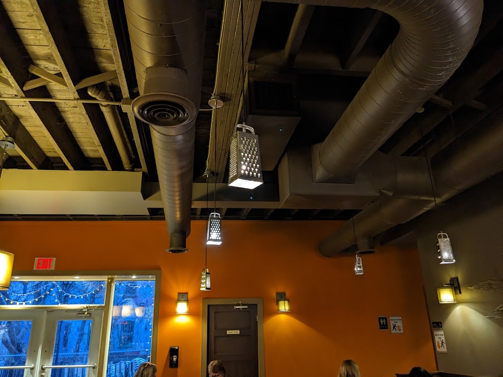 Intimate, friendly. Not some crazy fancy place that makes you feel like youve got to dress up, and also not some place thats a hole in the wall. Solid menu and great service. If youre looking for a nice night out with friends, casual dinner date. This place is for you. Also they have cheese graters for light bulb covers, which is hilarious