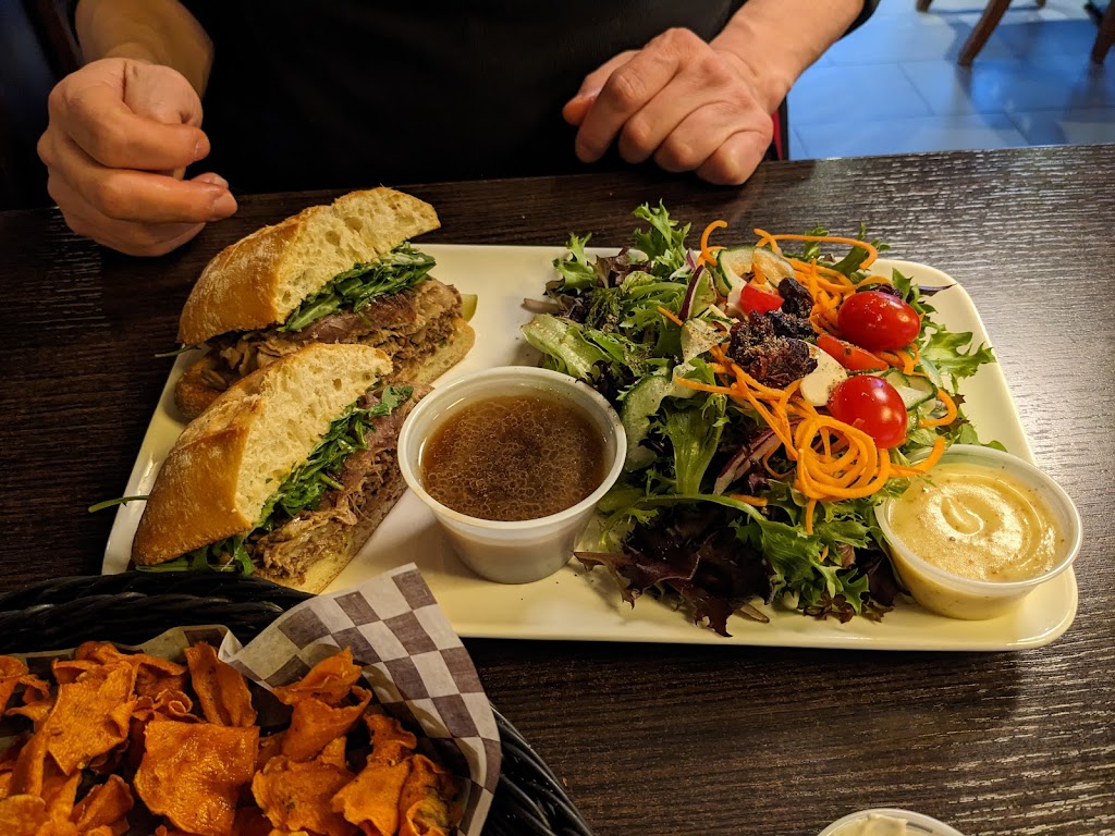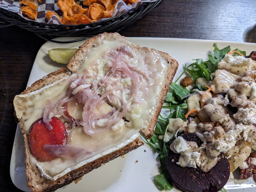 Service was short and straightforward - no big deal - but the food was super disappointing. We ordered the salmon dinner and it was $27 of way overcooked salmon and a lot of potatoes with some steamed veg. The apple & Brie sandwich was also a bit sad. Seems like lots of folks love this spot but it s not for us! This is the second time I ve tried takeout from here. Maybe eat-in is the way to go?