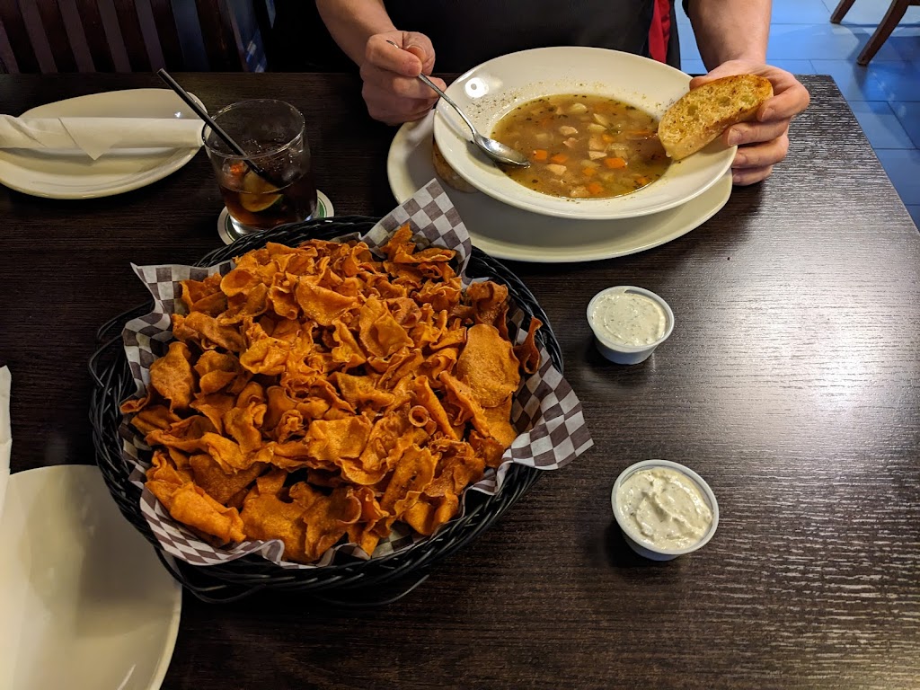 Went on a Saturday night and there were a few large parties in front of us. Service was pretty good. Our drinks came quickly and ordered the deep fried dough and cheese dip which was decent. My disappointment comes from the $20 fish and chips that came from a box.