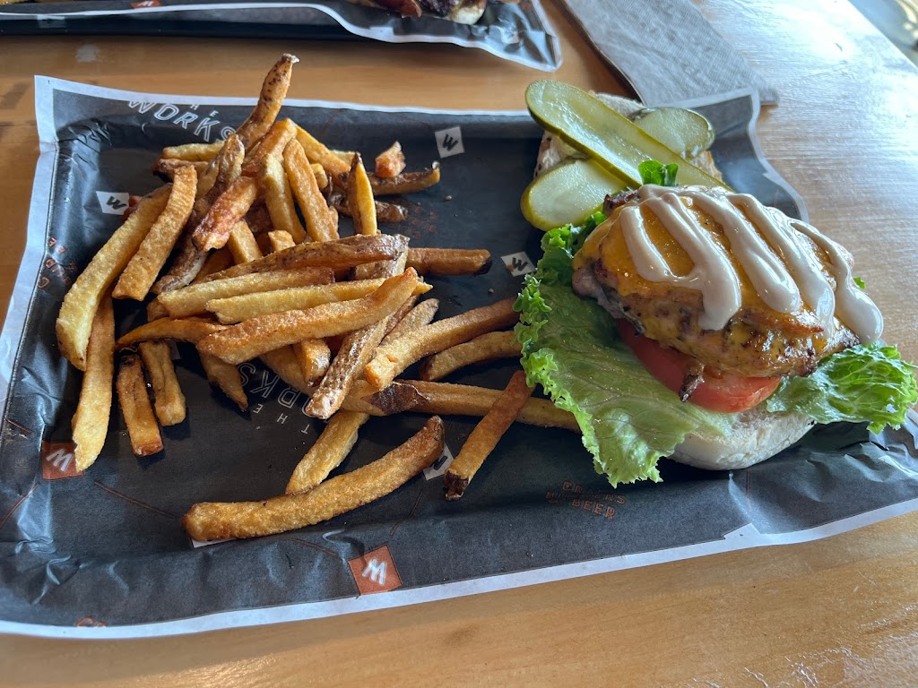 I went there with low expectations to be honest because I tried one of the WORKS branches in Kitchener/Waterloo and it was one of the worst beef burgers I've ever had (that location closed permanently a few months ago) I ordered two burgers, one beef (the Tom Green) and one chicken (Chicken Fight Club). The beef one was good unlike the one I tried in Kitchener. The chicken was tender and really good. So I would recommend it. I like how they offer different options for the bun. I got a white bun for the chicken and sesame multi-grain for the beef. The service was good but slow as there was only one lady serving all tables. It was a weekend so they should hire at least one more server.