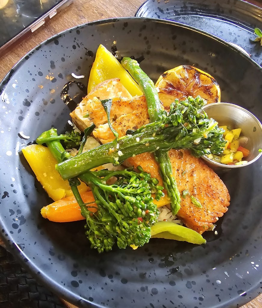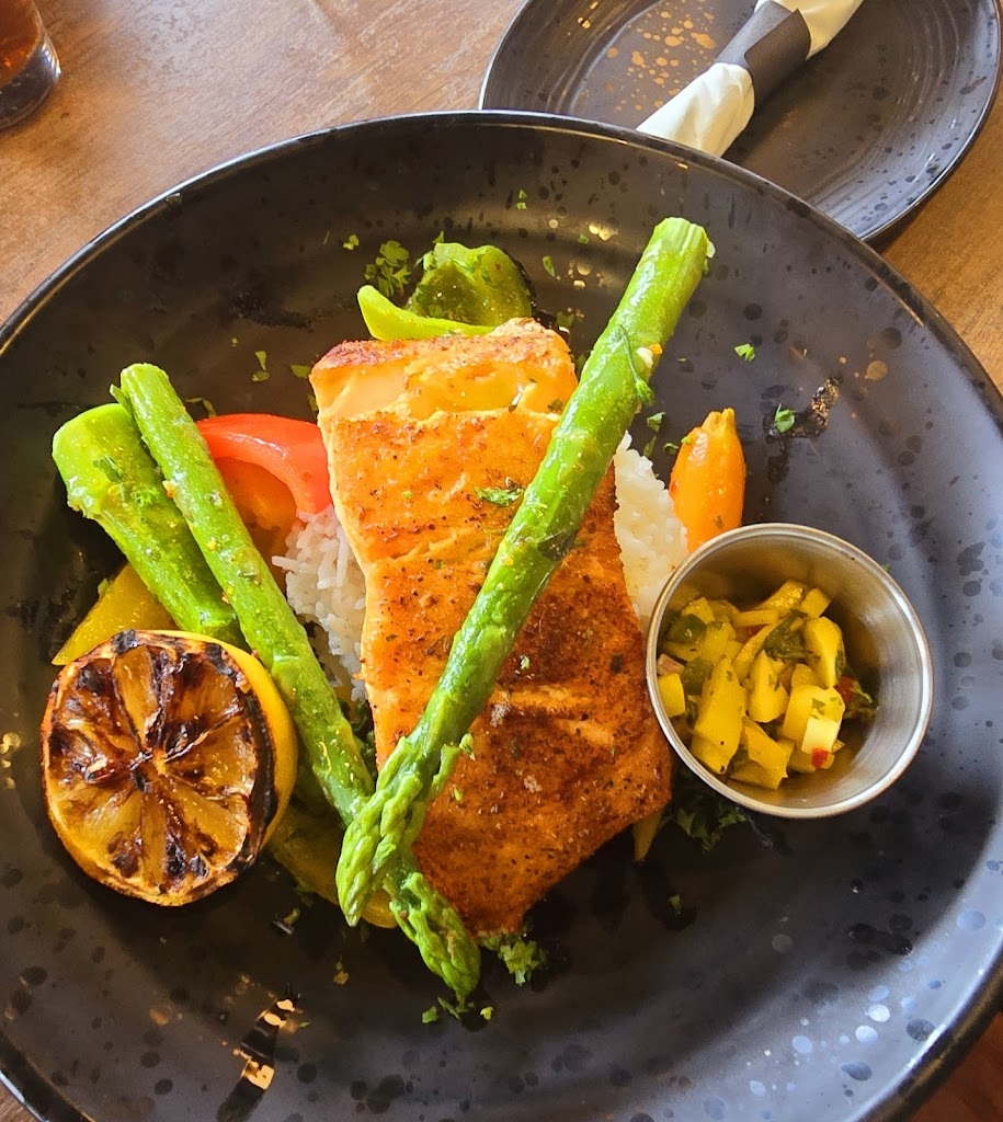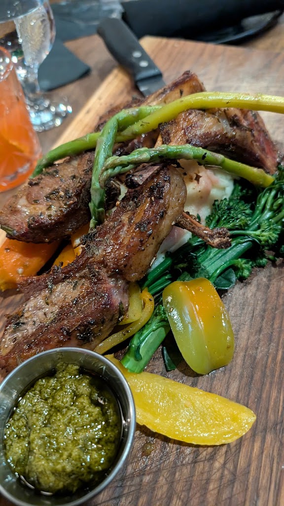 I have to give them 5 out 5 stars on all points! The food presentation was beautiful. I had the calamari to start and the salmon with mash and asparagas for my entree. Both were well seasoned and exceeded my expectations with a good sized portion for me to bring home to enjoy the next day The ambiance is gorgeous and is giving upscale, yet comfortable with cushy seating and dimmed lighting. Lastly, the service was impeccable. Very refreshing as many restaurants are lacking in this area. Our server was attentive, timely, and also able to make menu recommendations. I cant wait to return! I would recommend this for dining with friends or for a date night. Vegetarian options: Lots of great options for salads and pescatarian options also!