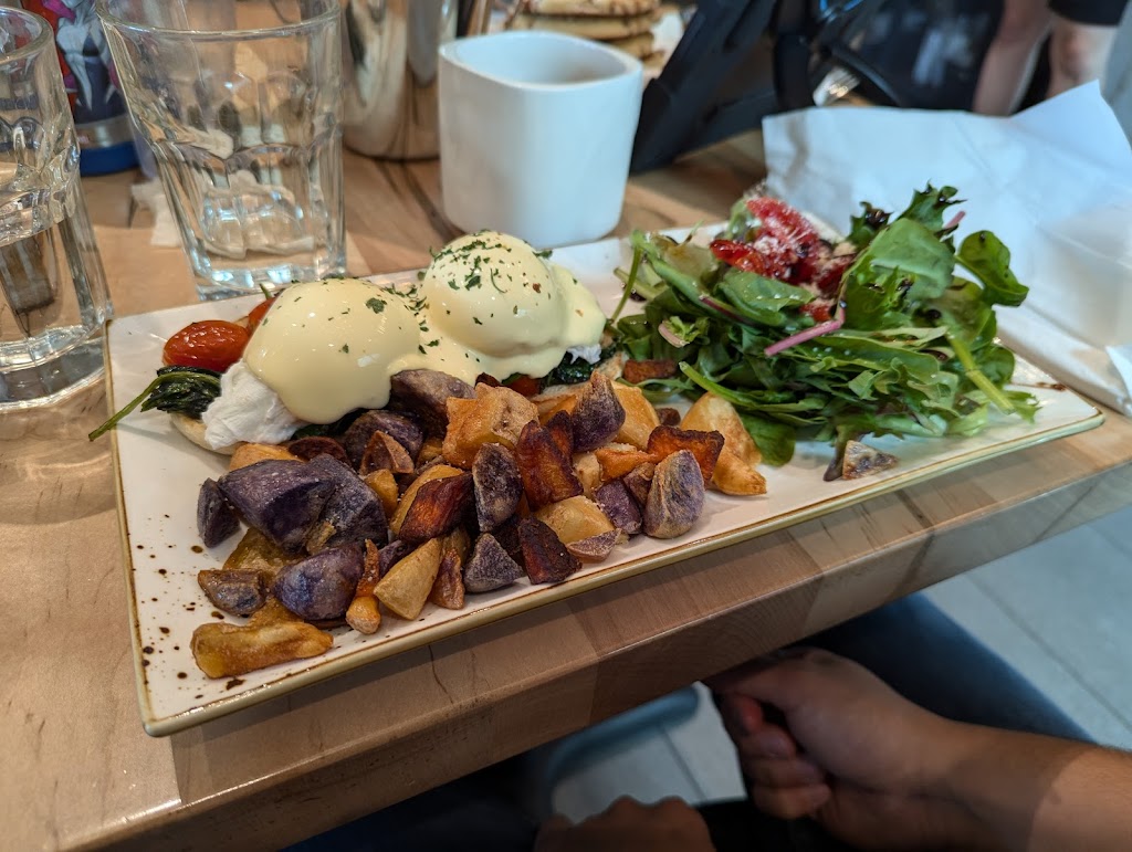 Eggs Benedict has delicious hollandaise sauce and the trip colour potatoes were crisp and tasty. Fast and friendly!