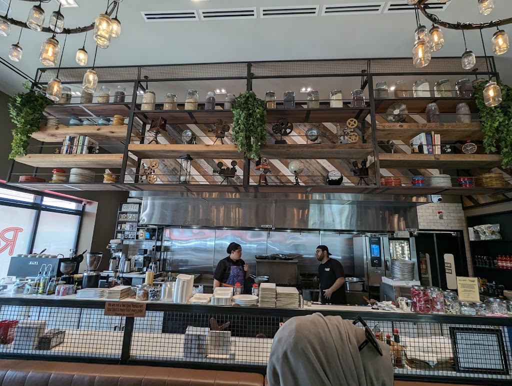 Great breakfast and lunch / brunch spot with an outdoor patio. I ordered the Salmon and Avocado Flatbread and it was delicious. The bread was crispy and not soggy as in some other restaurants. My wife had Moms Breakfast and also enjoyed it. Service is friendly and efficient and coffee refills are free. We will be back. Kid-friendliness: Saw lot of families with young kids enjoying a meal at that location. Wheelchair accessibility: Its at ground level just inside one of the mall entrances. No steps or obstacles.