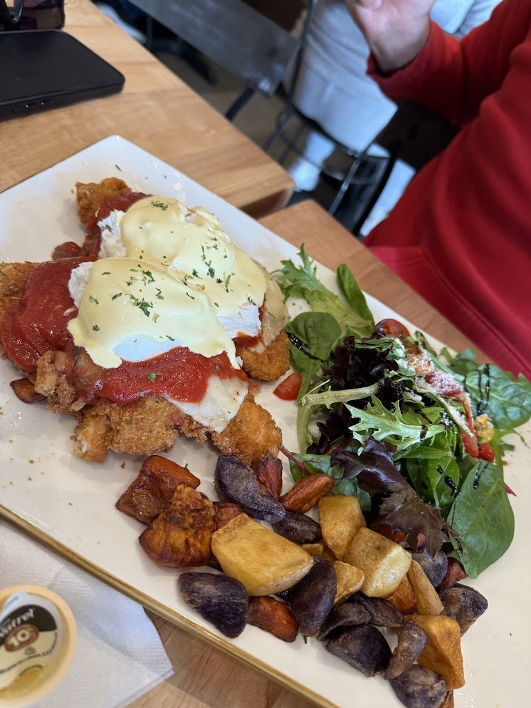Really enjoyed stopping by for brunch. We had eggs Benedict, and omelette and some pancakes. The omelette was so light and fluffy, and loved being able to customise it how we wanted. The chocolate chip pancakes were yum, but the crispy home fries were my favourite. Light at crispy on the outside and really fluffy inside. Coffee was great too. Overall a great meal, and service was top notch.