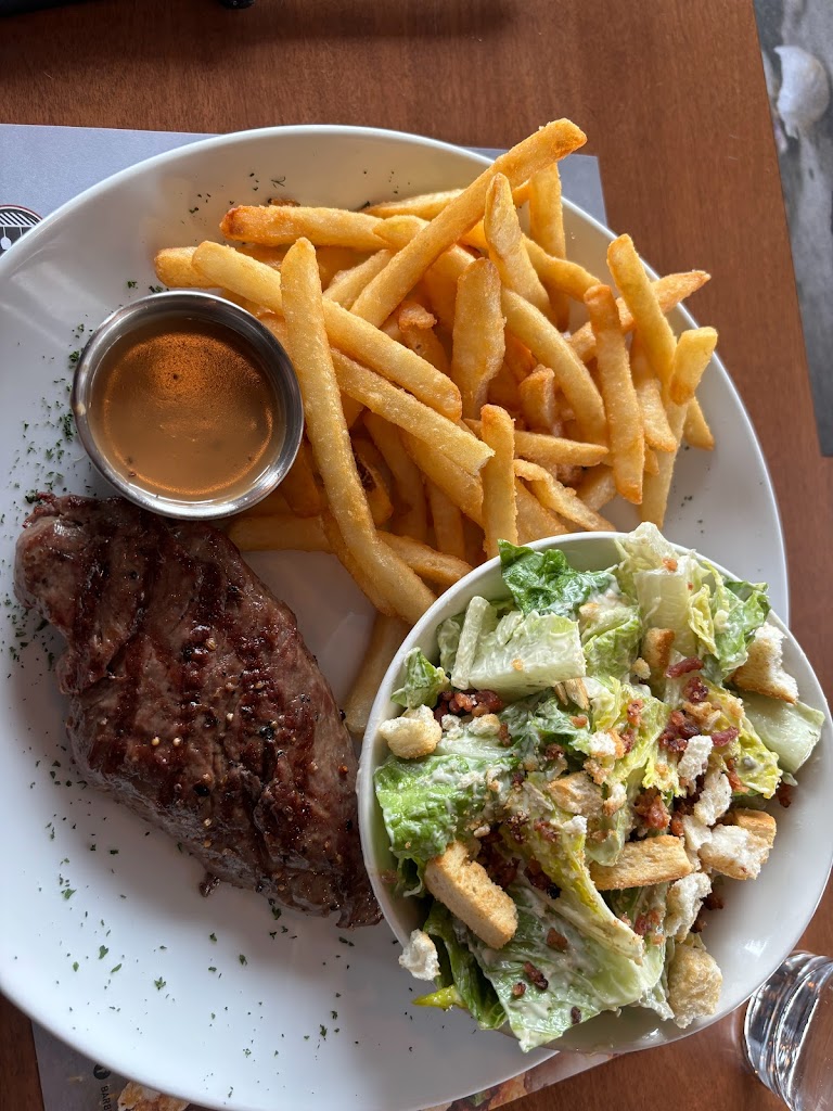 Excellent fried squid. While the steak, I liked it less. If Im not mistaken it was a strip loin. The fries were good. The Caesar salad was okay. However, the service was exceptional!