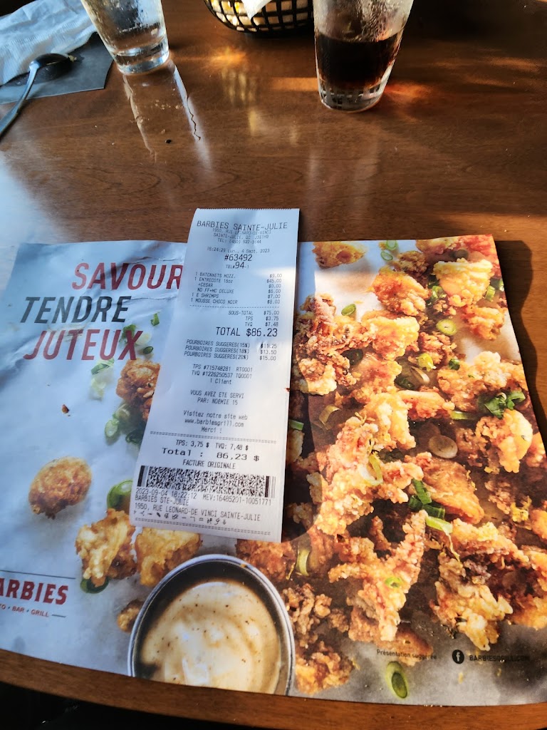 November 8, 2023 My son and I went to dinner with my son and me and to do lessons/homework at Barbies Sainte-Julie. Although it wasn t fun for the academic The charming Caroline who served us is affable, efficient and my little man who was hungry at 4:45 p.m. received his good meal in a few minutes, the popcorn is delicious too. I dont know how long she has been with the Group, Bravo for this hire!! Sure you take care of it