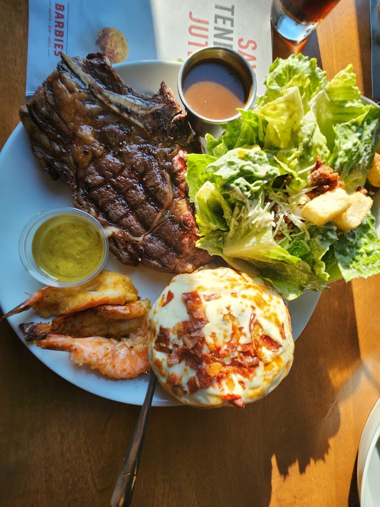 We both opted for steaks, including filet mignon, no choice of side dish was mentioned by the waitress when taking the order....the rice was very bland and lukewarm. Salads with too much market dressing. The waitress did not come to see us once during our meal. We had to flag him down to order a glass of wine...first experience for us at Barbies, very disappointing for a $150 bill.