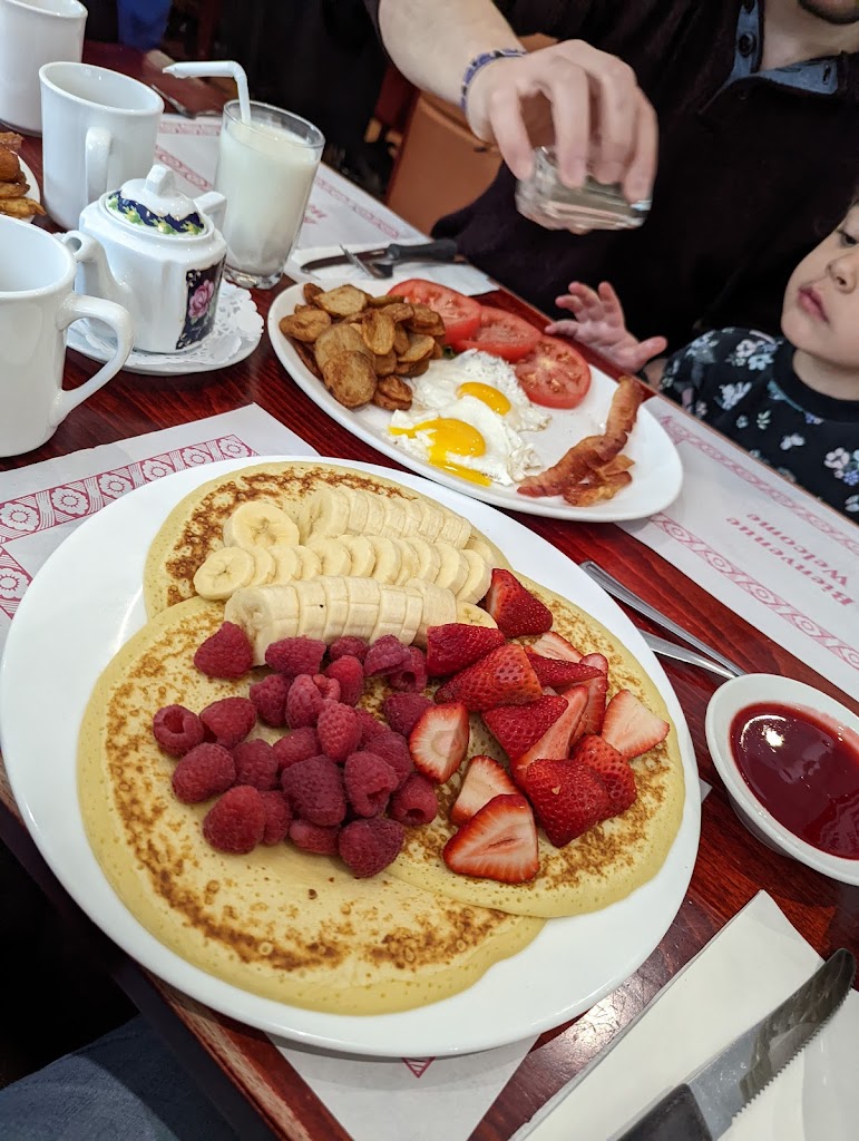 Ordered on Doordash combo eggs and crepe with fruits! Sausag, potatoes and eggs extremely salty! Like someone sprinkled salt all over! As for the crepes portion for a toddler! This restaurant charged 42$ and I had to throw half away! NEVER NEVER AGAIN