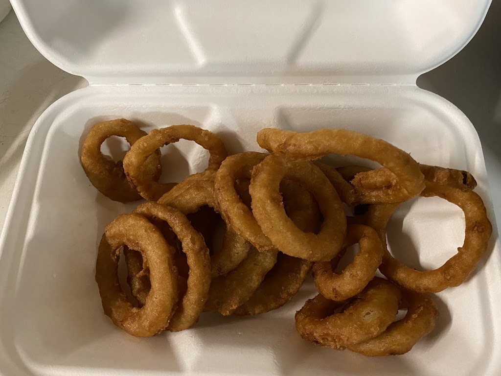 Burnt onion rings, soggy bun with a dry hamburger patty with no flavour.