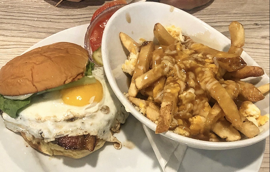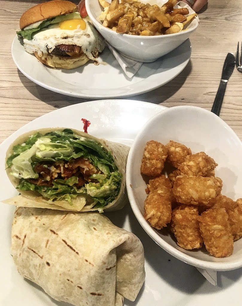 Stopped in for dinner tonight & tried a couple different things. We started with the garlic knots. Which were good, but I felt they could have used a lot more garlic butter & cheese. Especially since you have to pay extra for the cheese it was definitely lacklustre. I had the buffalo wrap with tater tots. It was delicious but definitely didn’t have enough chicken or buffalo sauce. Since it came with Caesar dressing on the lettuce it definitely saved it. Tater tots were delicious & you can never go wrong with those! My husband had the breakfast burger with poutine & said it was good. It was super busy so our waitress was doing her absolute best to keep up with the crowd. She was super friendly & answered all of our questions.