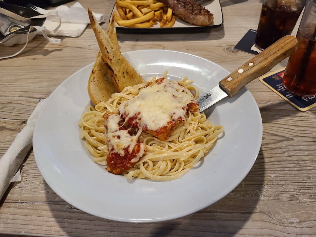 Food and service were great! We had chicken Parm with linguine Alfredo, the sauce was a little on the watery/ light side but still tasty. The steak was cooked rare and the fries were perfect with a very crispy exterior and soft inside. Looking forward to coming back to try more of the menu items.