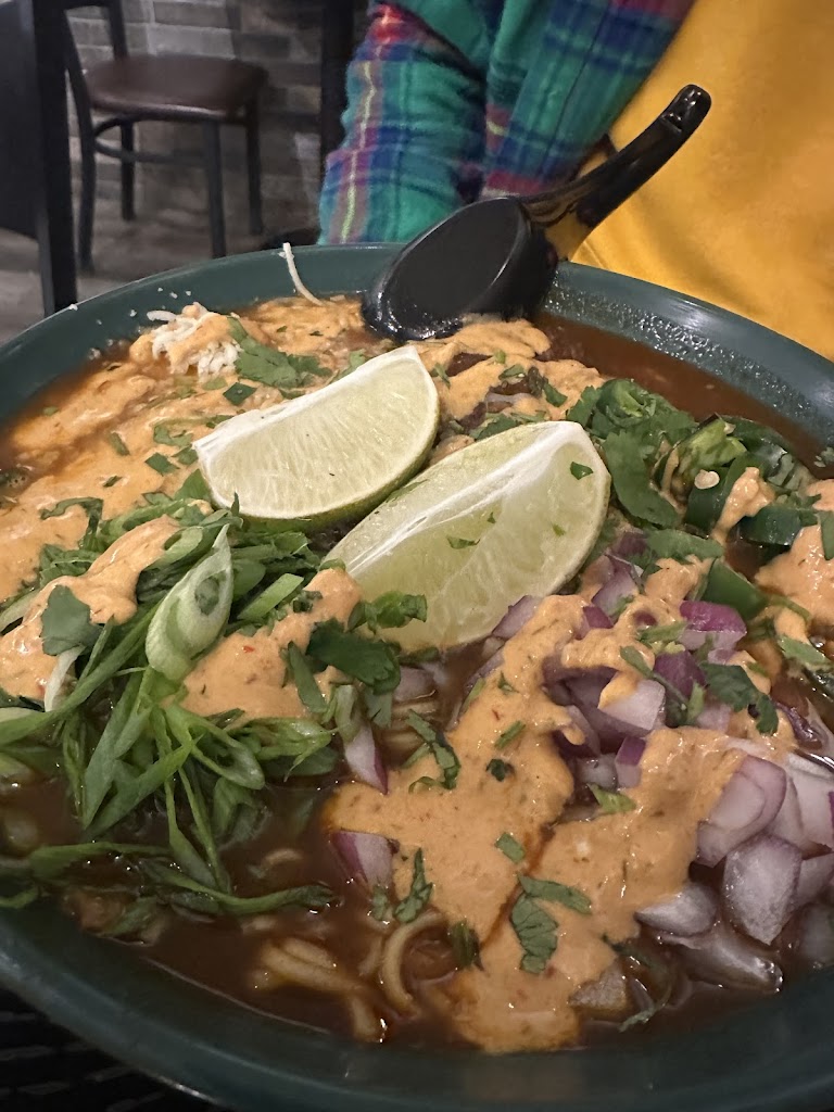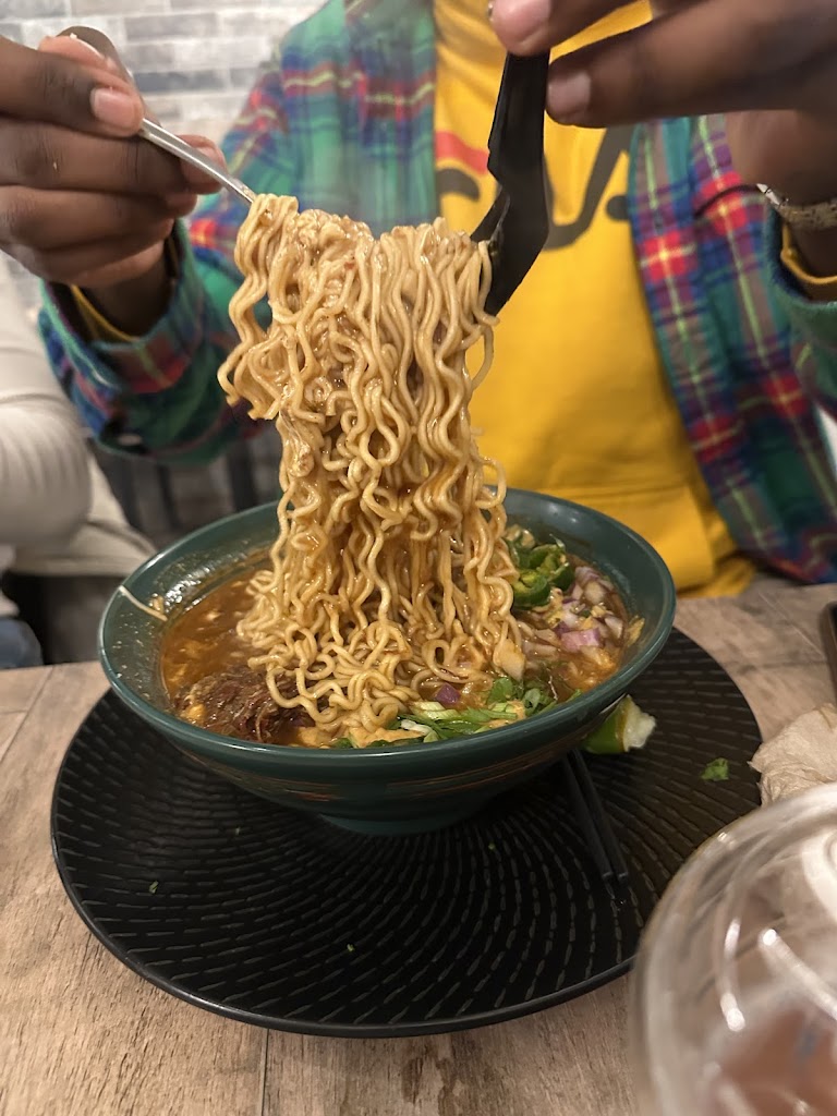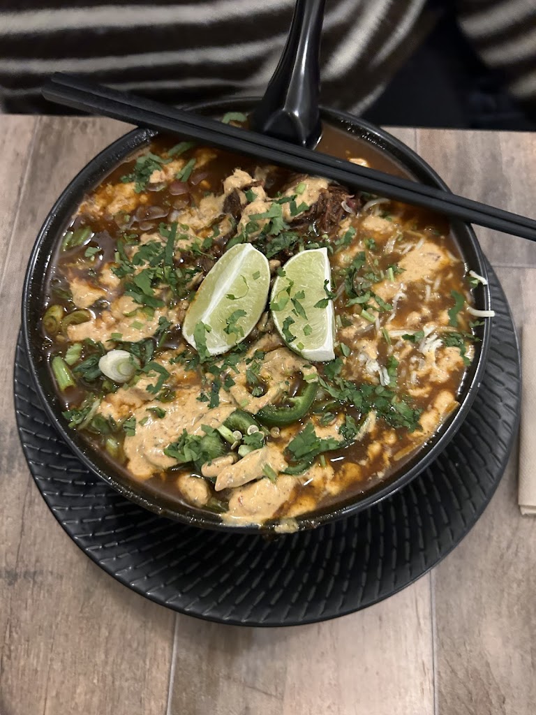I had the birria ramen, it was good, rich meat. My only complaint is that it was way too salty, I was only able to have like 10 spoons and I couldn t eat any more. My boyfriend had Tacos and mac & cheese. I didn t try his tacos, but he seemed to like them. The mac & cheese was not that good, we didn t finish it. Service was great. My only complained about the atmosphere would be that the music was too loud.
